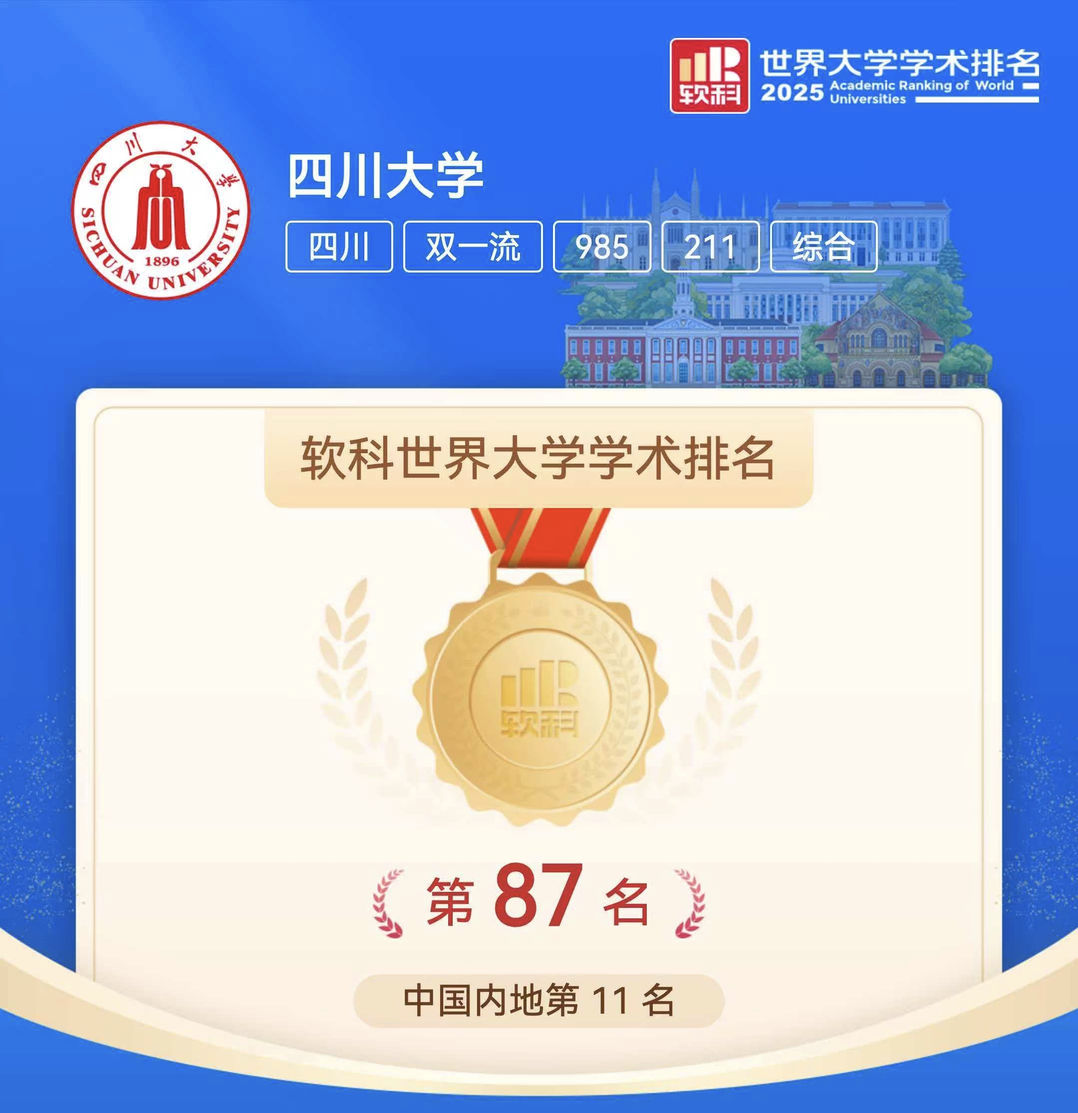 软科世界大学学术排名跃居全球第87位。