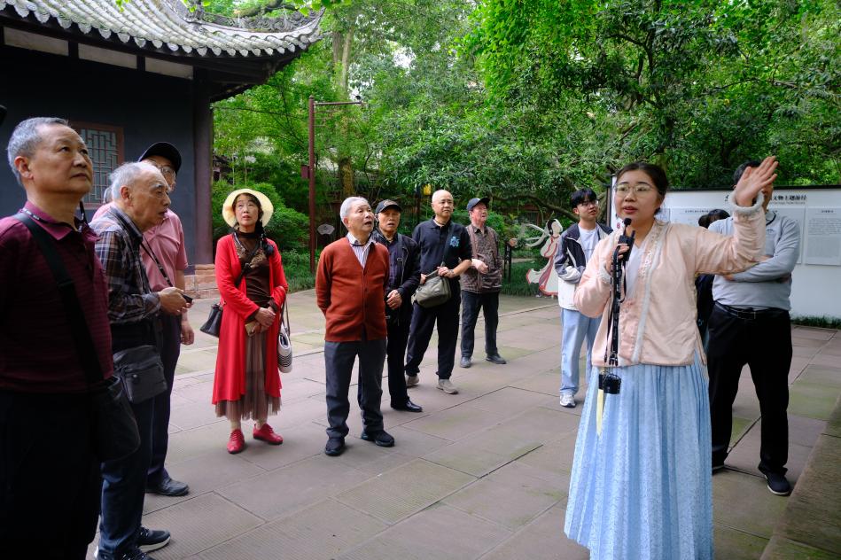 随后,一行人前往三苏祠参观学习。在讲解员的引导下,大家沿着古朴典雅的园林路径,依次参观了大殿、启贤堂、来凤轩等历史建筑,系统了解了苏洵、苏轼、苏辙的生平经历、文学成就以及流传千年的家风家训。祠内丰富的文献资料与历史遗存,生动展现了“三苏”深厚的文化底蕴与家国情怀。通过现场参观与讲解,大家对中华优秀传统文化的内涵有了更加深入的理解,也进一步体会到“三苏”崇文重教、修身齐家的精神价值。