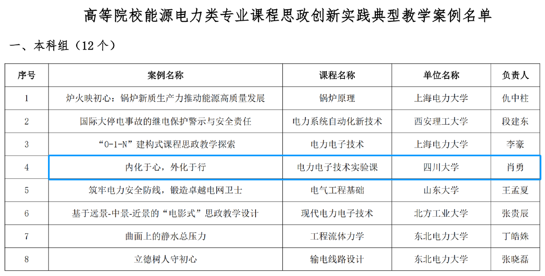 肖勇老师负责讲授的《电力电子技术实验课》,从全国38所高校申报的能源电力类专业课程思政创新实践案例中脱颖而出,被中国电力教育协会认定为能源电力类专业课程思政创新实践典型教学案例。这是成人影视片