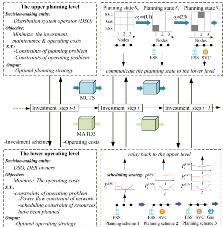 该文针对分布式能源资源规划中多不确定性(如第三方运营商对安全约束的部分可观测性导致的隐式不确定性)挑战,首次构建了一种自适应分层学习架构。该框架通过双层Stackelberg结构协同优化分布式资源的位置、容量和运行策略,无需依赖模型简化或预定义场景。论文在标准和实际配电算例系统上验证了该方法的有效性,在保证电网安全前提实现更低的投资成本、更快的求解速度,能提升规划效益。