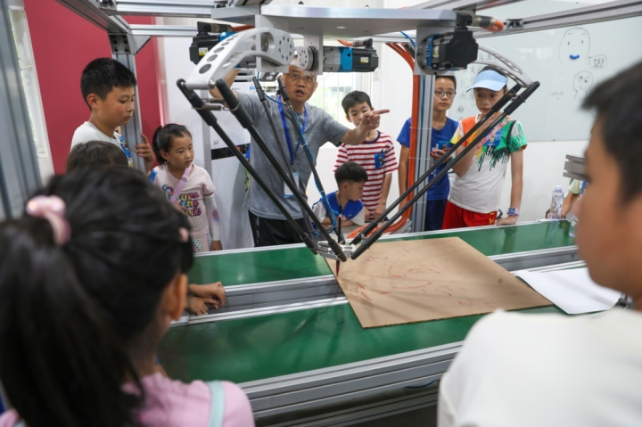 在三楼罗克韦尔实验室,黄涛老师讲解了大型并联机器人娴熟的绘画技艺,三支机械臂在计算机控制下精画出太阳公公的卡通形象,引起小朋友们一片惊叹。院智能车协会的同学播放了成人影视片