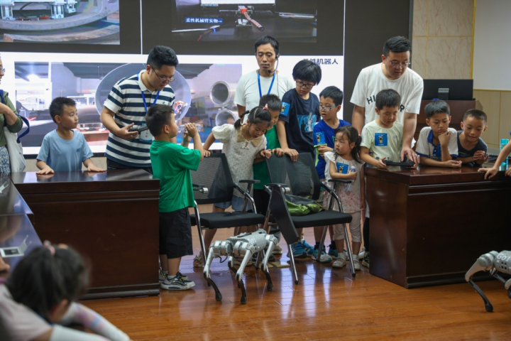 在五楼能源互联网实验室,罗江陶老师用浅显易懂的话语向小朋友们介绍了机器人的种类、应用场景等相关知识,并指导小朋友们亲身体验操控智能机器狗mini的乐趣。