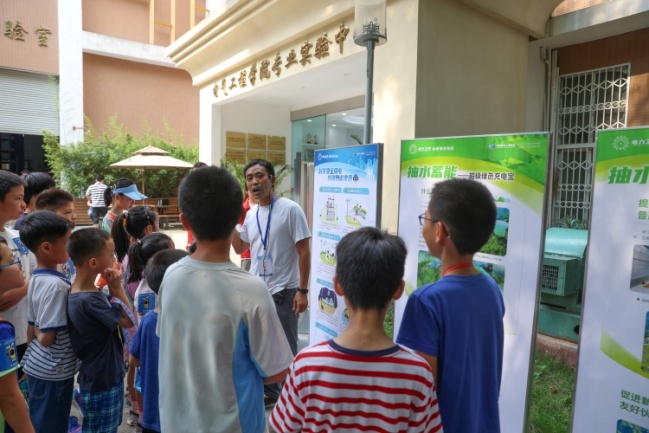在实验楼顶楼小朋友们近距离观摩了以前只在电视里见过的太阳能光伏板和风机,了解了光伏发电与风力发电的原理,对清洁新能源发电有了具体的认识。