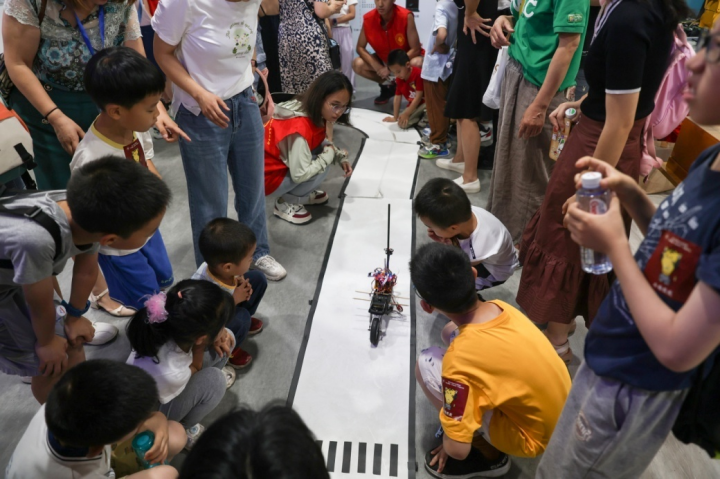 火锅战队参加全国高校机甲大赛的精彩视频,并现场演示了两种赛车的比赛情形,激发了小朋友们极大的兴趣。